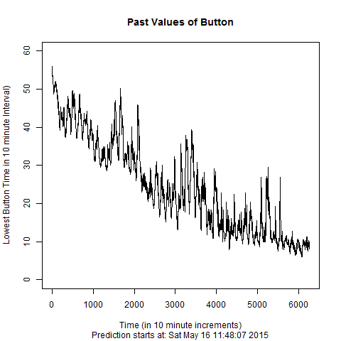 plot(fitted(reg), main=”Past Values of Button”, xlab=”Time (in 10 minute increments)”, ylab=”Lowest Button Time in 10 minute Interval)”, ylim=c(0,60))