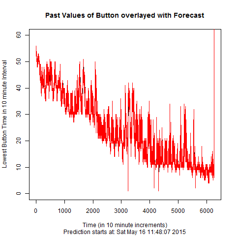 plot(fitted(reg), main=”Past Values of Button overlayed with Forecast”,xlab=”Time (in 10 minute increments)”, ylab=”Lowest Button Time in 10 minute Interval”, ylim=c(0,60))
