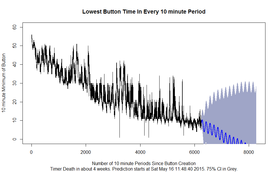 Out of the grey collection of possible futures highlighted, it looks like button is declining steadily, the general future looks rather grim. The upper line of the grey 75% confidence interval is below 30 seconds, suggests that the timer will not be kept at over half for a full 10 minutes ever again. [This prediction did not end up to be true.] I note that the existence of a good forecast means that the red guard can simply pay extra close attention to the period in which they think it will end, and this forecast might actually extend the life of the button. Maybe.